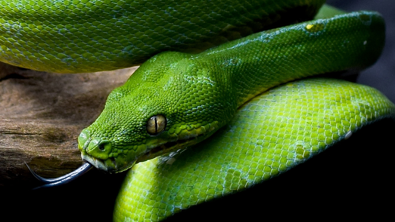 Der Grüne Baumpython ist eine bis zu zwei Meter lange Schlange, die auf Bäumen in Neuguinea, Indonesien und Australien lebt. Als Dschungelbewohner mögen sie es gerne feucht und heiß. Im Terrarium sollten daher Temperaturen um die 30 Grad Celsius herrschen und die Halter müssen zweimal pro Tag warmes Wasser zur Befeuchtung versprühen. Zum Fressen brauchen Jungtiere etwa alle sieben Tage zwei bis drei Mäuse, erwachsenen Tieren genügt ein Rhythmus von etwa 14 Tagen. Füttern sollte man die Schlange nur mit einer Pinzette, damit das Tier Hand und Maus nicht verwechselt. Die Schlange ist für Kinder oder Anfänger nicht geeignet. Wer sich für das neue Haustier entschlossen hat, sollte darauf achten Schlangen aus einer Nachzucht zu erwerben und keine illegal importierten Tiere.