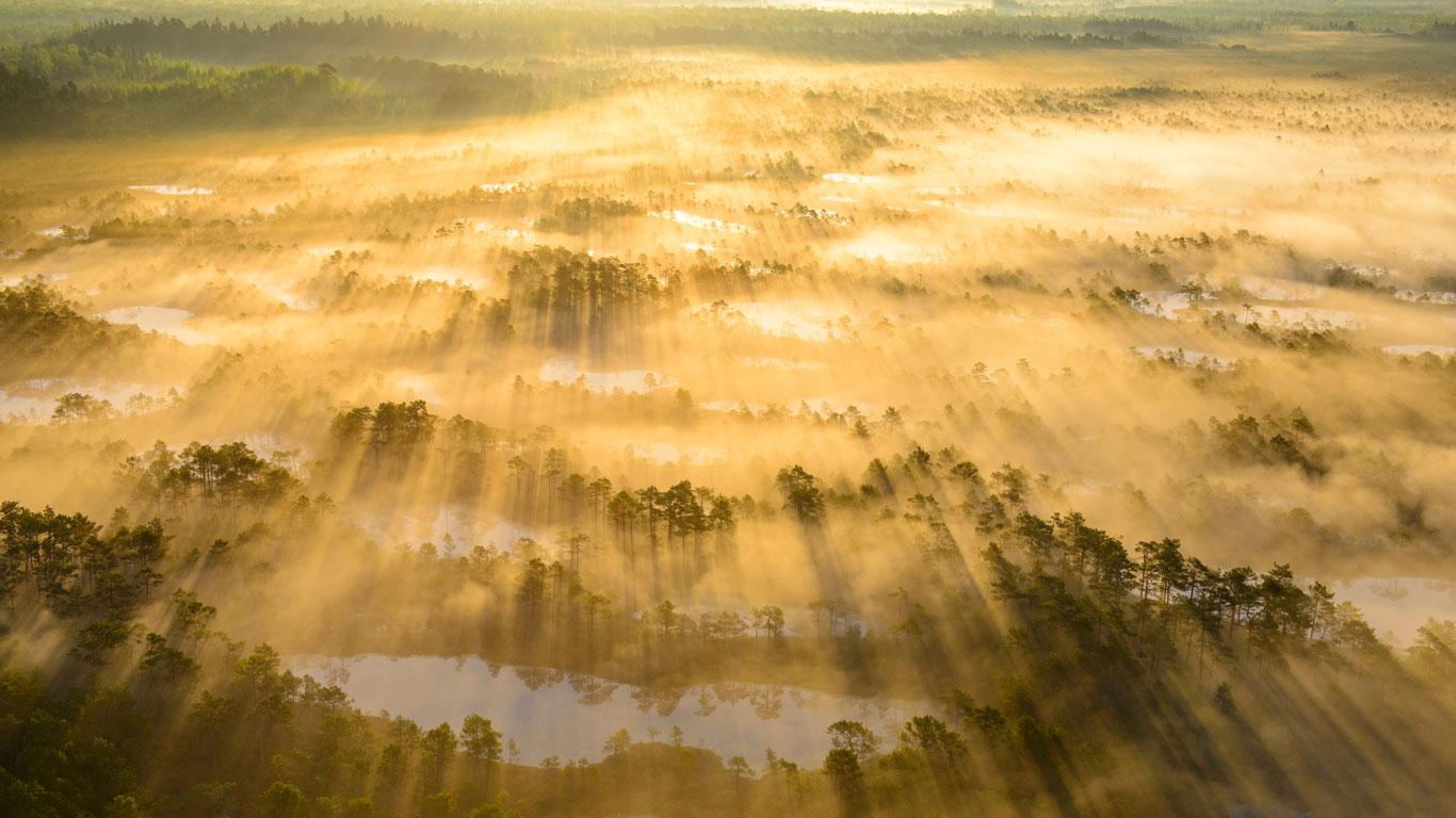 Für gewöhnlich erscheint uns Nebel grau, ungemütlich und geheimnisvoll. Doch Fotograf Sven Zacek erwischte auf einem Helikopter-Flug über die estländischen Moore einen ganz besonderen Moment – golden angestrahlt sehen die Nebelschwaden aus, als wären sie Sonnenstrahlen, die sich früh am Morgen ihren Weg durch den Wald bahnen.